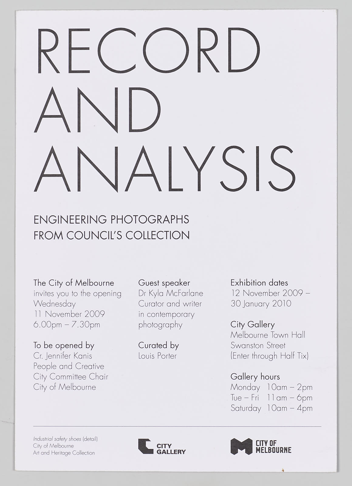 Record and Analysis was a curatorial commission from the City of Melbourne Arts and Heritage Collection and was exhibited at the City Gallery in 2009. Using the Council’s collection of engineering photographs as material it explored the aesthetic and conceptual potential these utilitarian photographs contained. It presented the engineering photographs as a self-contained archive and to further rupture the photograph’s meaning I anonymously donated a selection of photographs to the archive and used them to augment the exhibition.